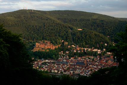 Die Heiliggeistkirche in der Altstadt vom Phiosophenweg aus gesehen. Der Philosophenweg zieht sich am gegenüberliegenden Hang des Michelsbergs über den Villen von Neuenheim entlang und bietet einen fantastischen Ausblick auf Schloss und Altstadt.